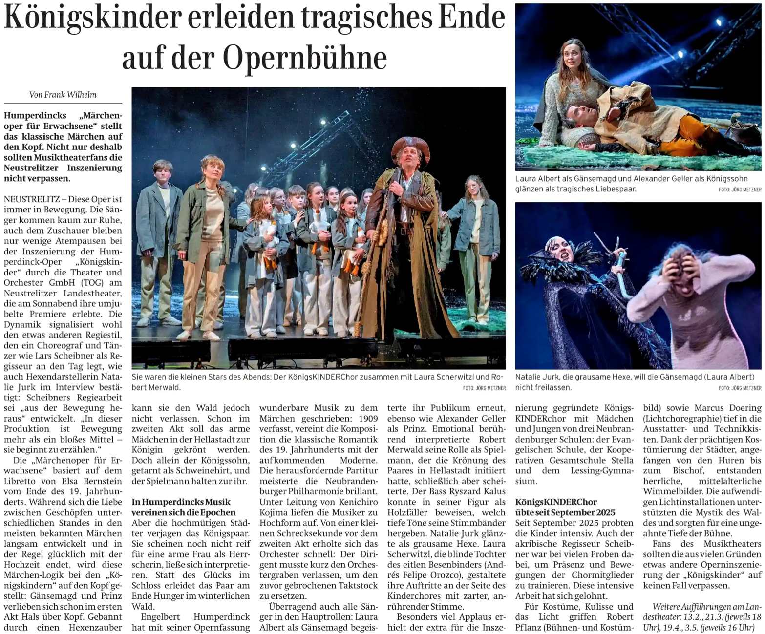 Wer sich die phantastische Oper "Königskinder" nicht entgehen lassen will, hat noch an folgenden Terminen Gelegenheit, den KönigsKINDERchor, das großartige Ensemble der TOG und die brillante Neubrandenburger Philharmonie unter der Leitung von Kenichiro Kojima im Landestheater Neustrelitz zu erleben: